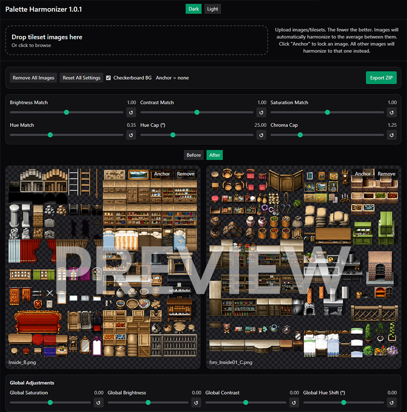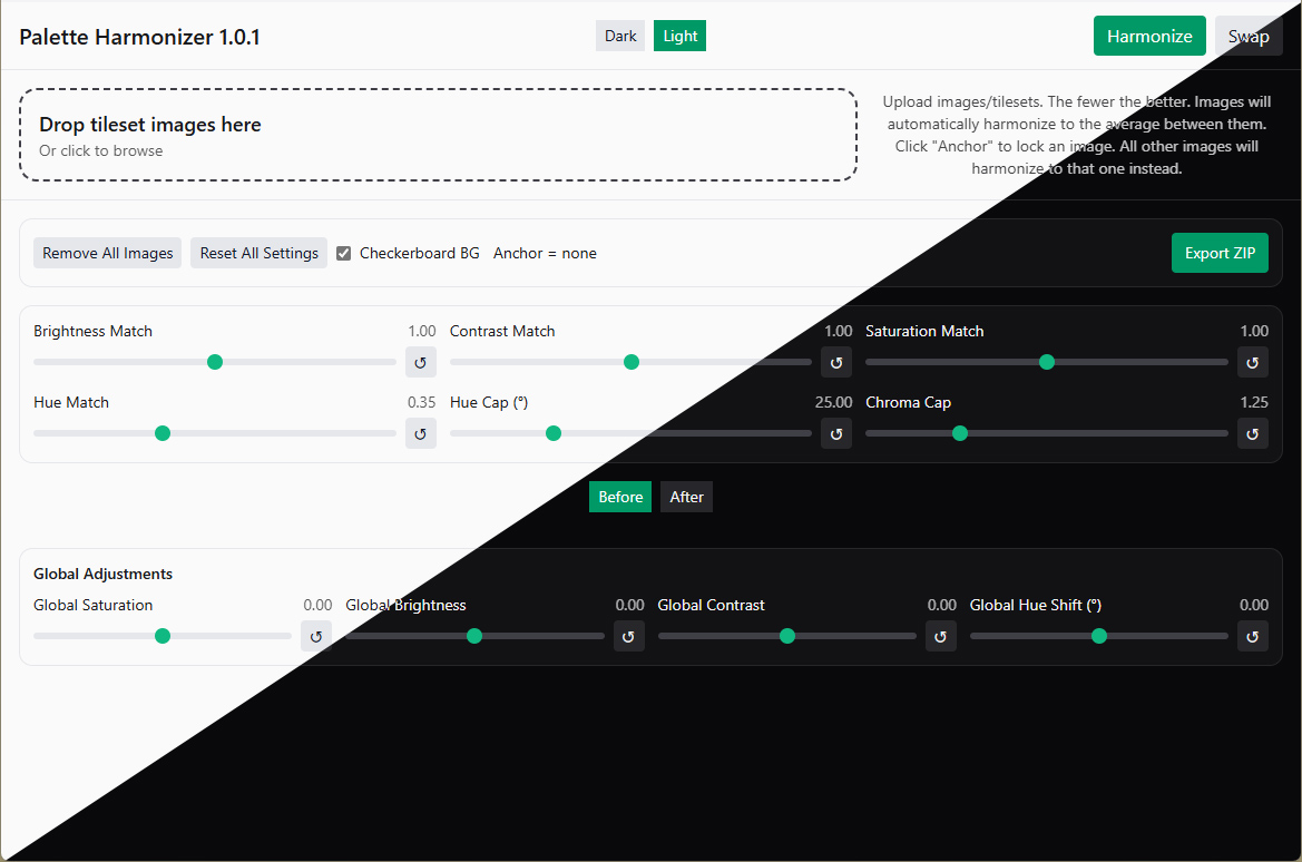 - Upload multiple tilesets and the program will harmonize them, meeting their colors "in the middle" (an average)