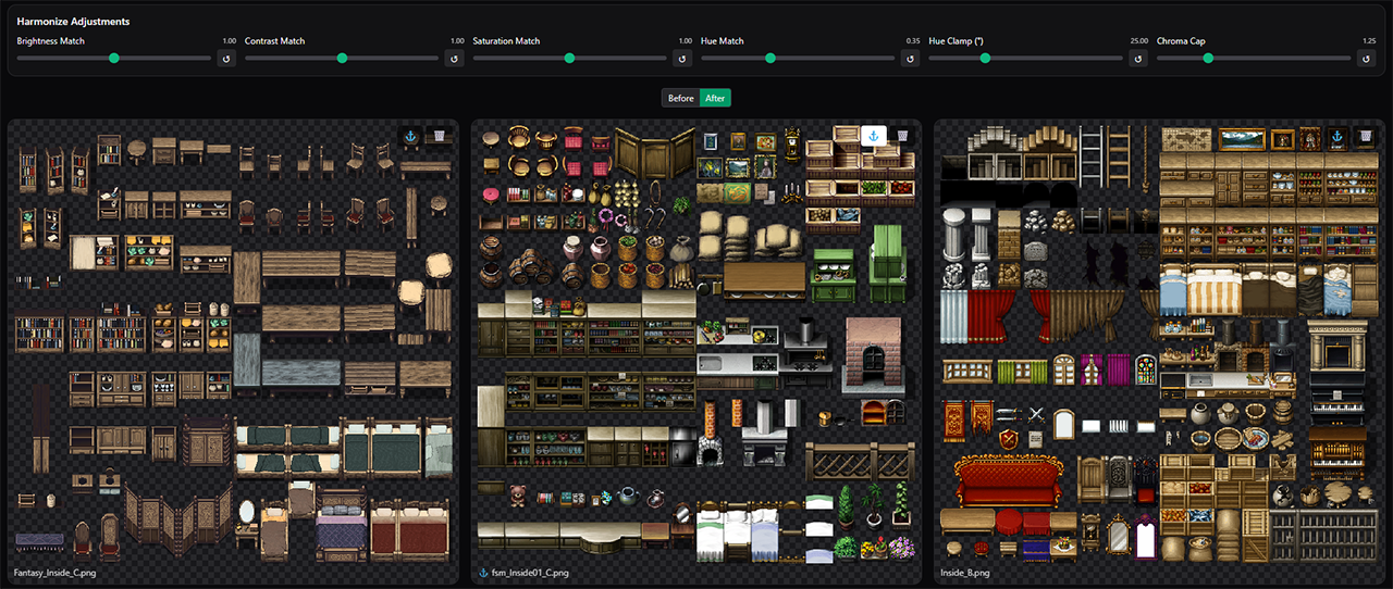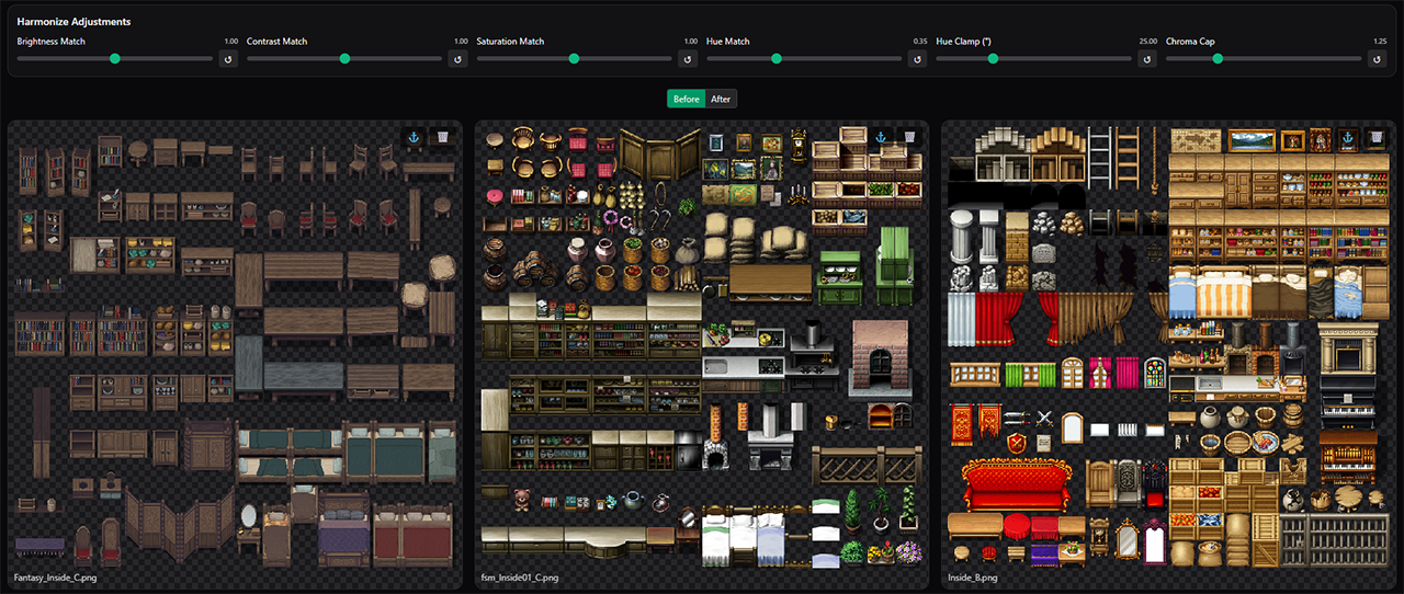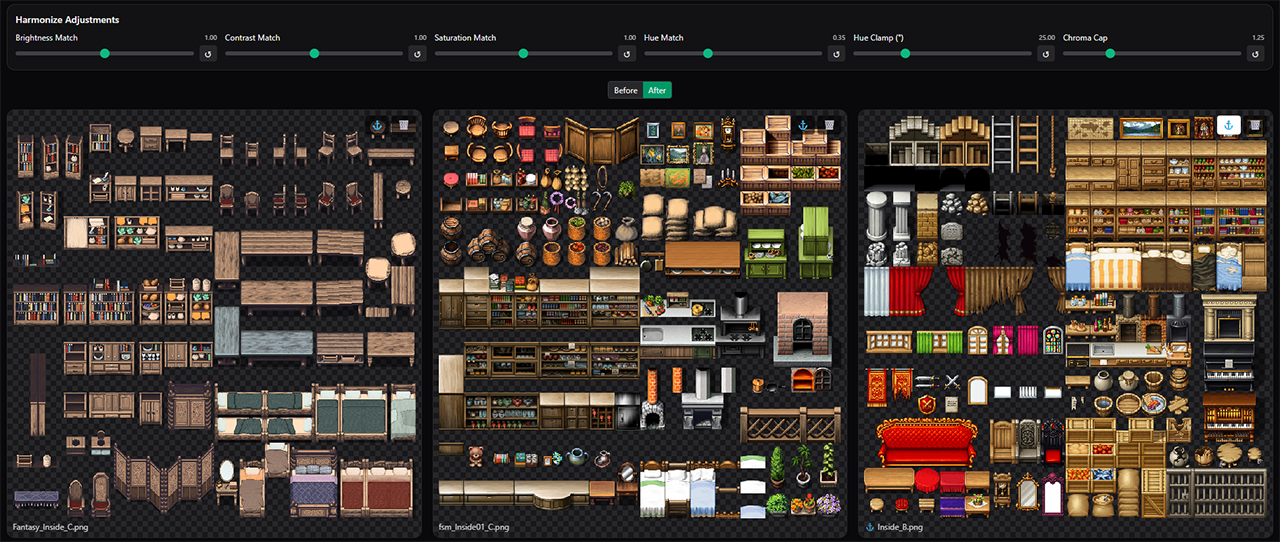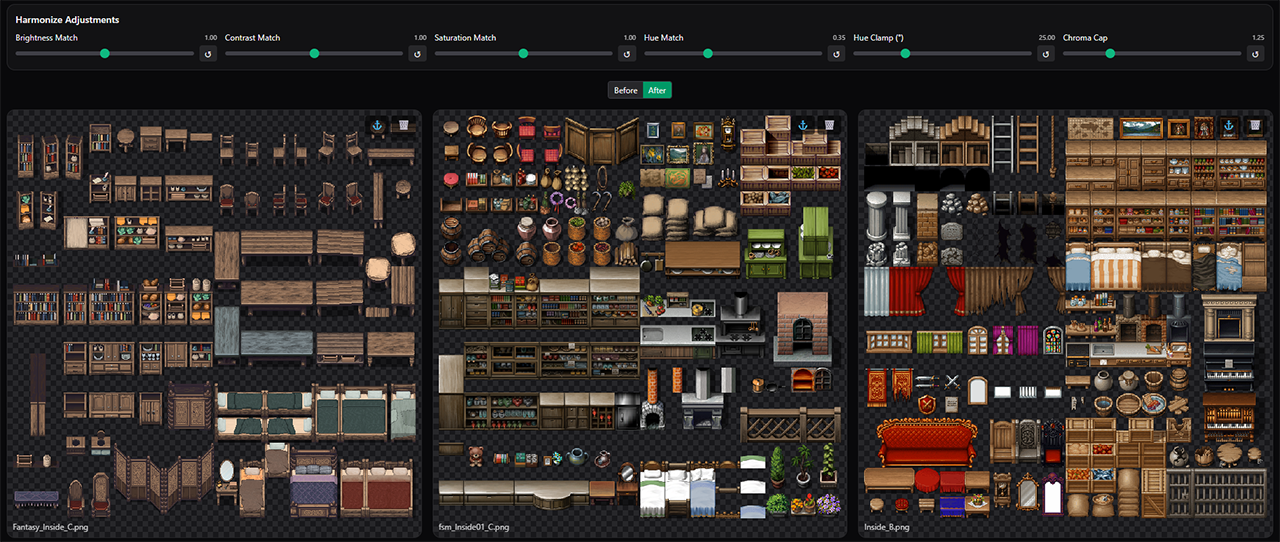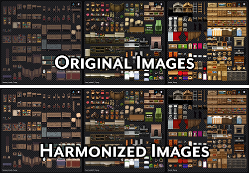 - It doesn't work well with tiles that need to match other tilesets (for example, if you have a tree in one tileset, and extra leaves/decorations for the tree in another tileset, the colors likely will not match after harmonizing; these types of tiles should be put together into one image instead)