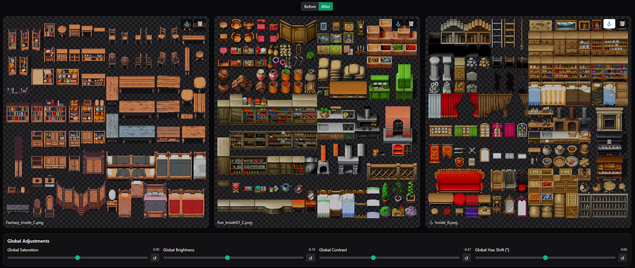 I made this little program for my own project in RPG Maker, but I imagine this can be used for any type of image! I've bought a lot of tilesets throughout the years, and they all have their own particular "vibes" - while RPG Maker's default RTP is very bright with high saturation, some are far less so, and combining the two make them feel off and disjointed.