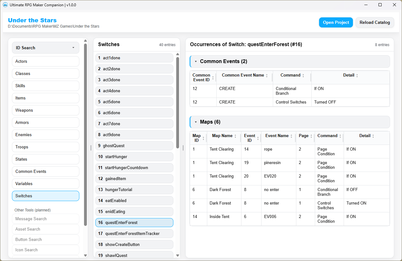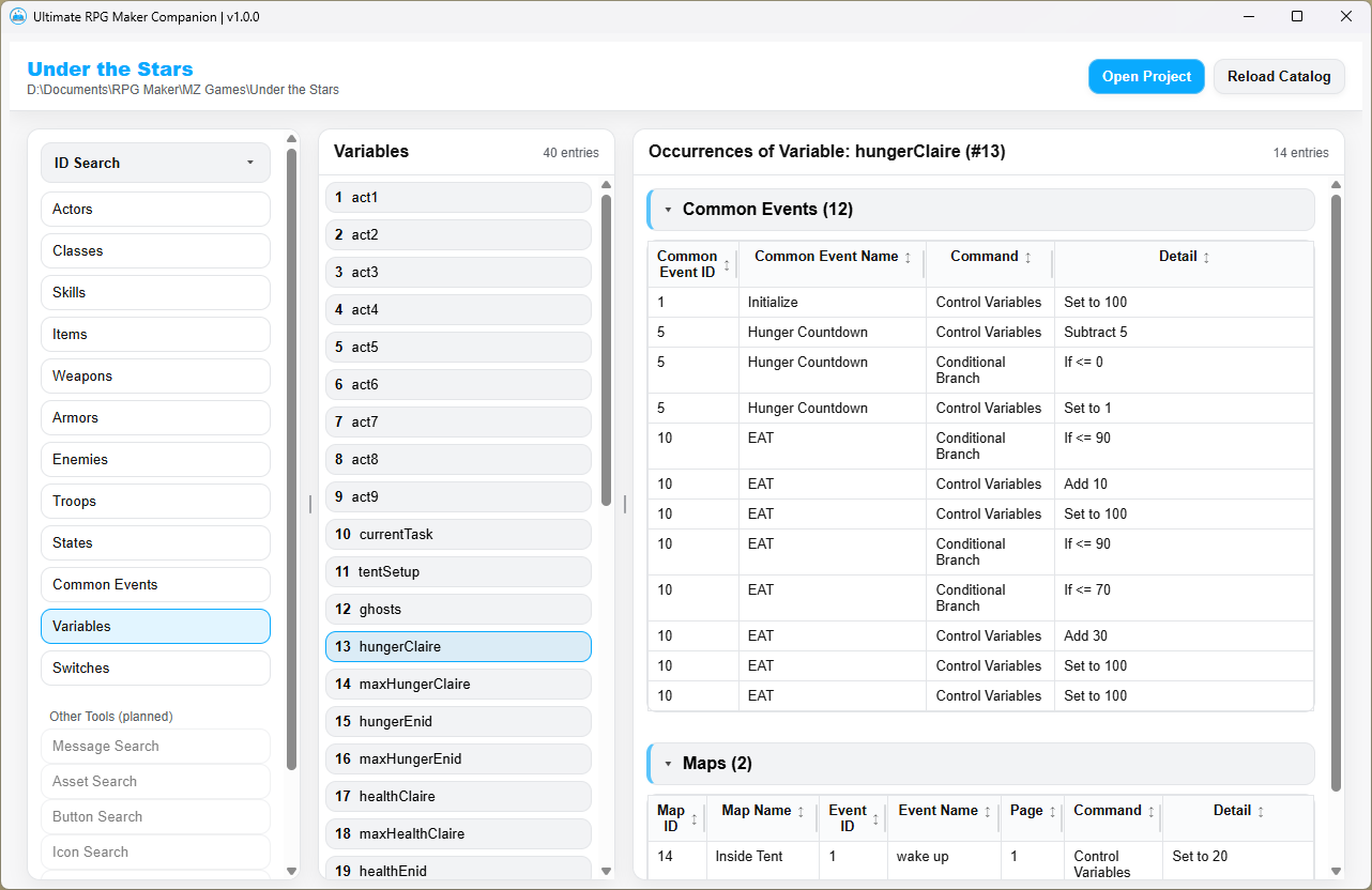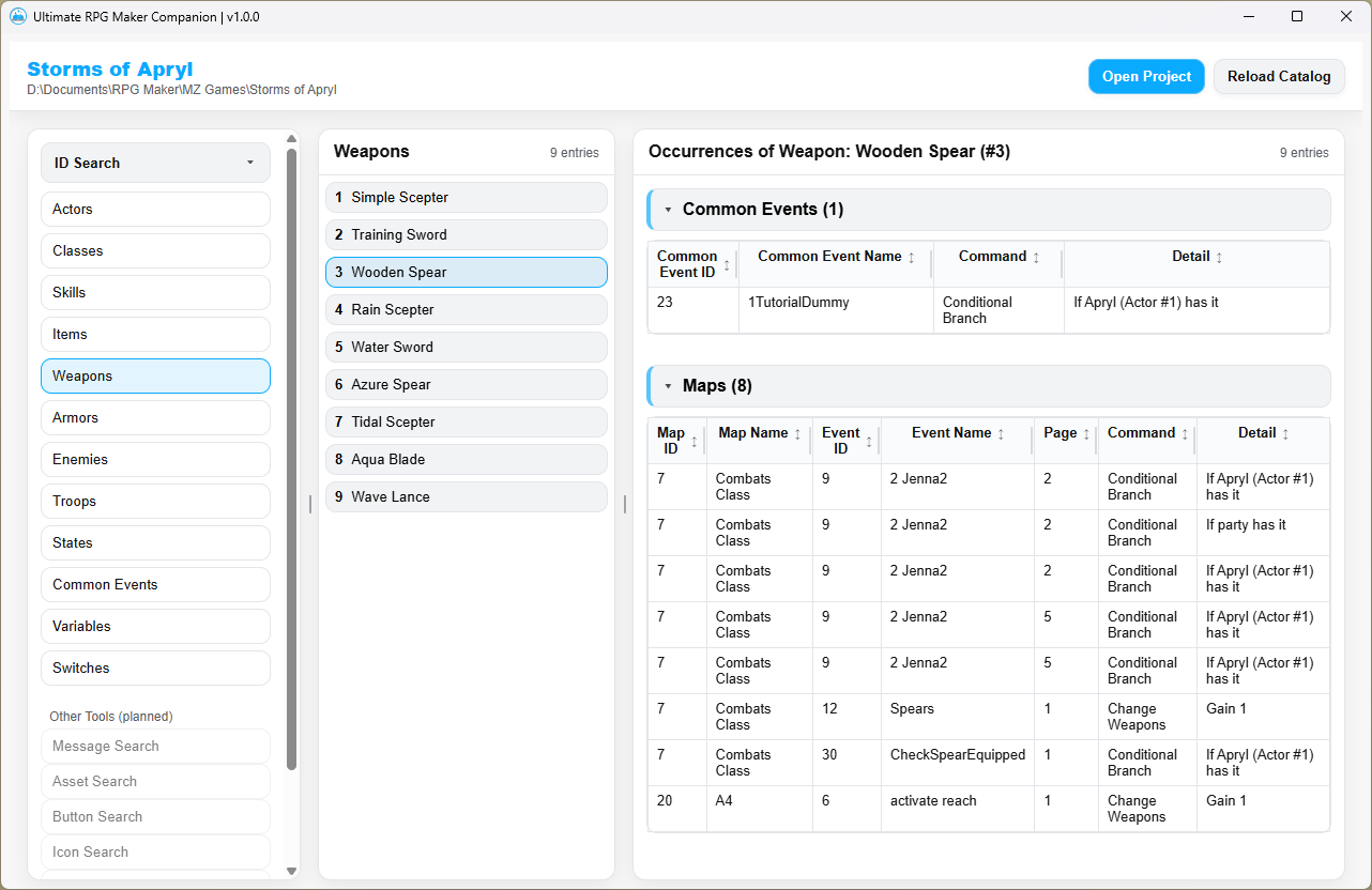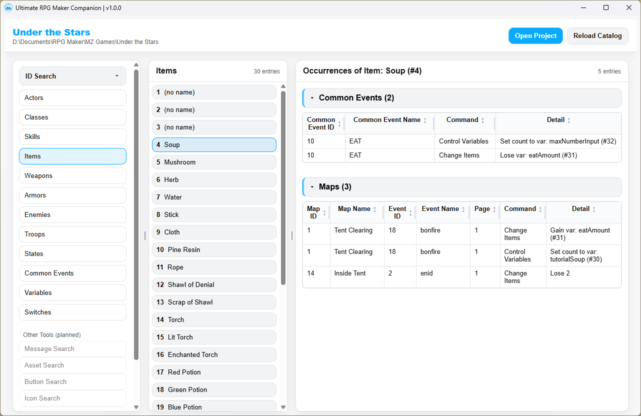 Do you ever find yourself feeling indecisive about how to sequence your items, switches, variables, common events, etc. in the engine? What if you want to change their placement later on? RPG Maker runs on IDs, so everything from your items and skills to switches and variables. If you ever move or replace one, the engine won't automatically update all the references throughout your events. Moving things around is difficult, particularly after you've made a lot of progress!