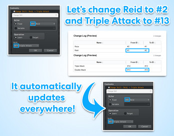 - If moving variables or actors, it also updates text tags like \V[x] and \N[x], in messages and damage formulas (script support coming later!)